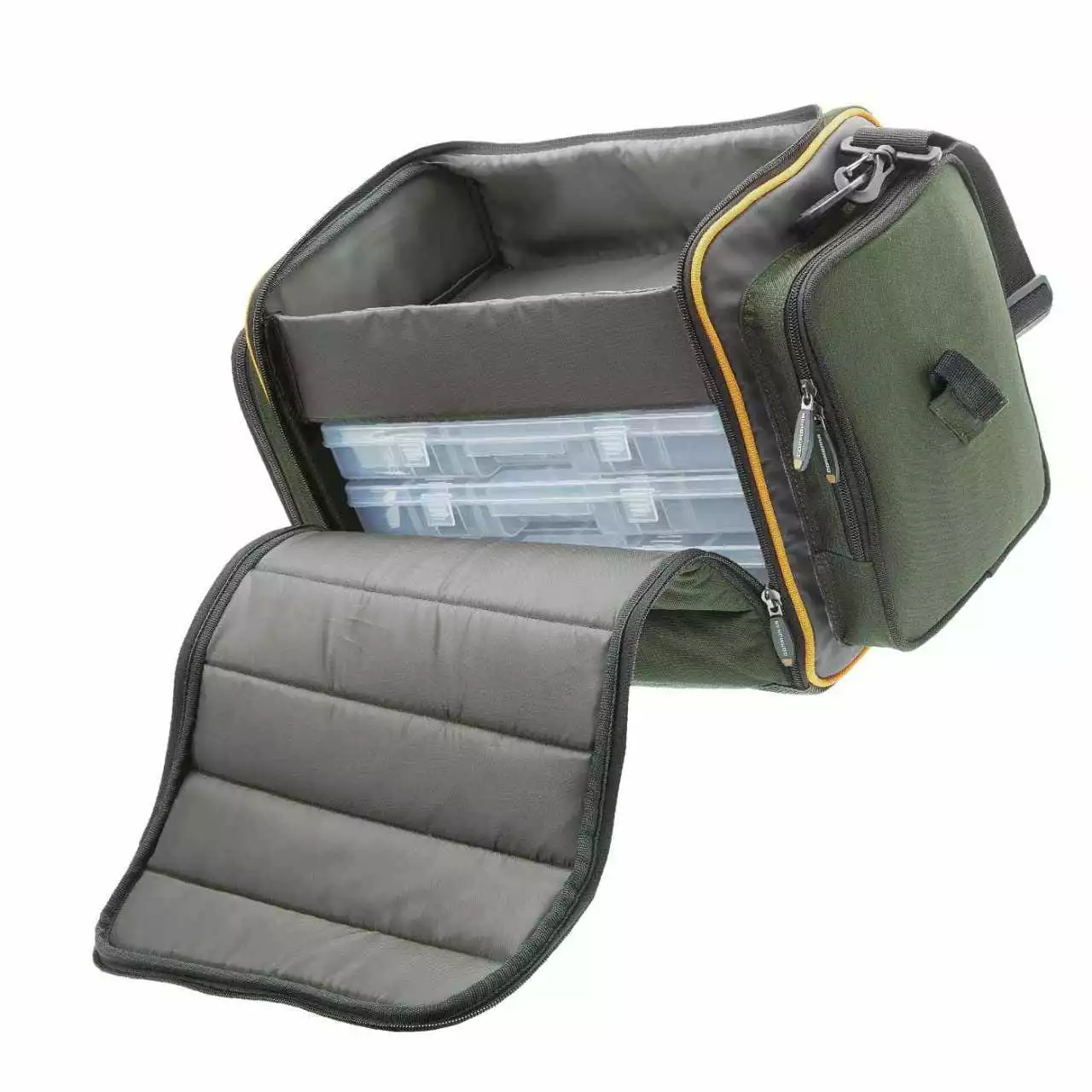 Gut gepolsterte Spinnfischer Einsatztasche im klassischen “Frontloader” Stil mit 2 getrennten Hauptfächern, die über einen gemeinsamen Taschendeckel zugänglich sind!
